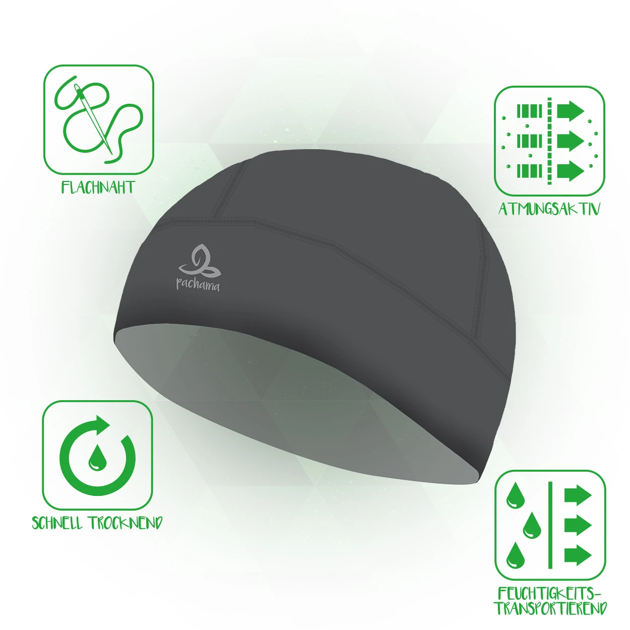 Der Hat der Marke pachama ist zu 100% aus hochwertigem Polyester gefertigt. Diese funktionale Mütze verfügt nur über besonders wenige flache Nähte, wodurch ein angenehmeres Tragegefühl entsteht. Ebenso wird Feuchtigkeit ideal abtransportiert und die Mütze ist nicht nur atmungsaktiv sondern hemmt außerdem die Geruchsbildung, weil sie antibakteriell ist. Ein weiterer großartiger Vorteil ist die schnelle Trocknung.